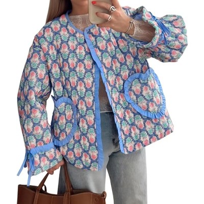 Tankaneo Womens Cropped Puffer Jacket Floral Print Open Front Quilted Jacket Bow Tie Heart Coat Lightweight